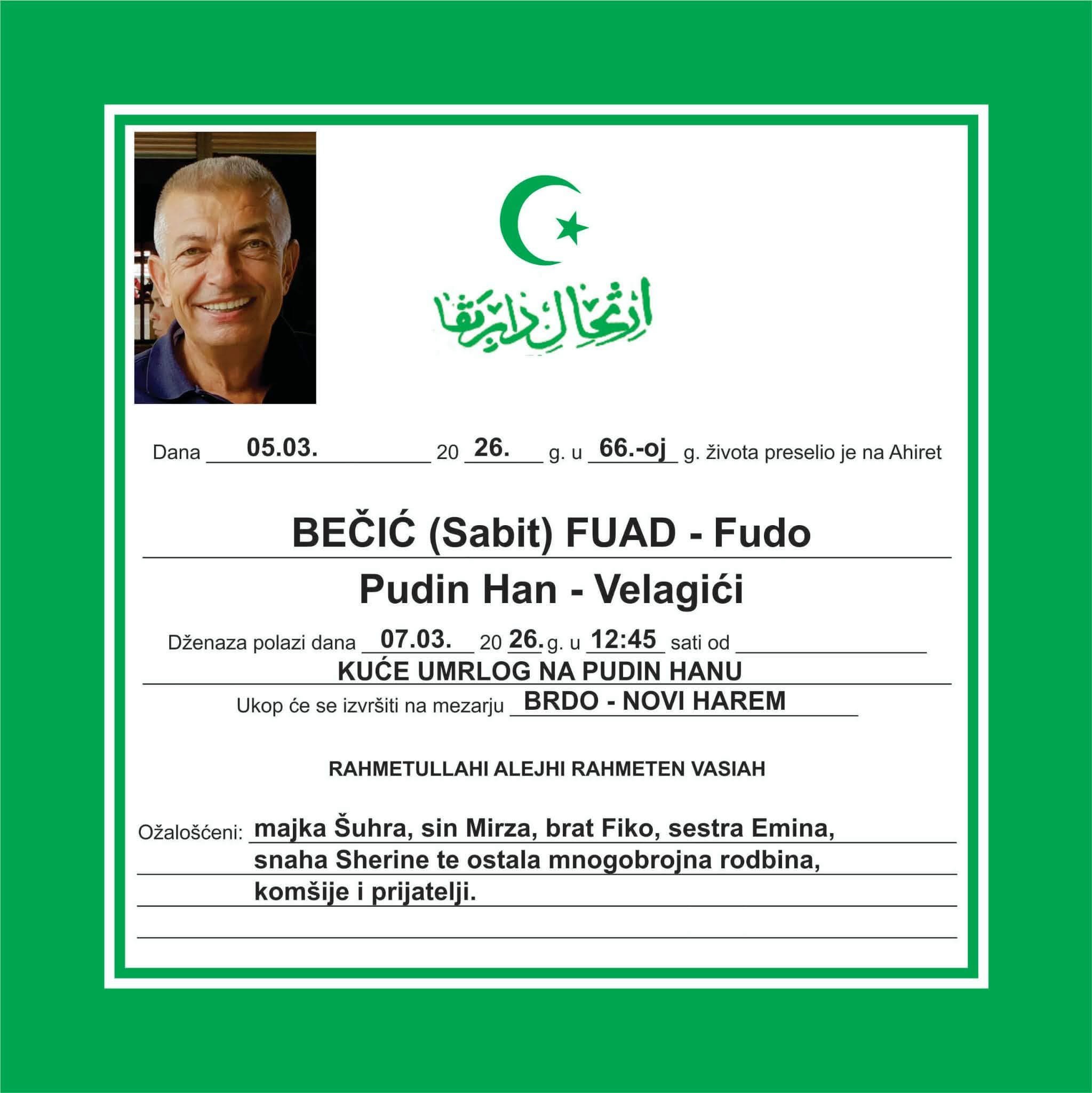 Dženaza polazi dana 07.03.2026. godine u 12:45 sati od kuće umrlog na Pudin Hanu.