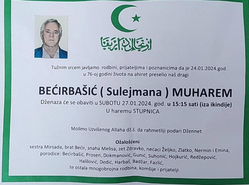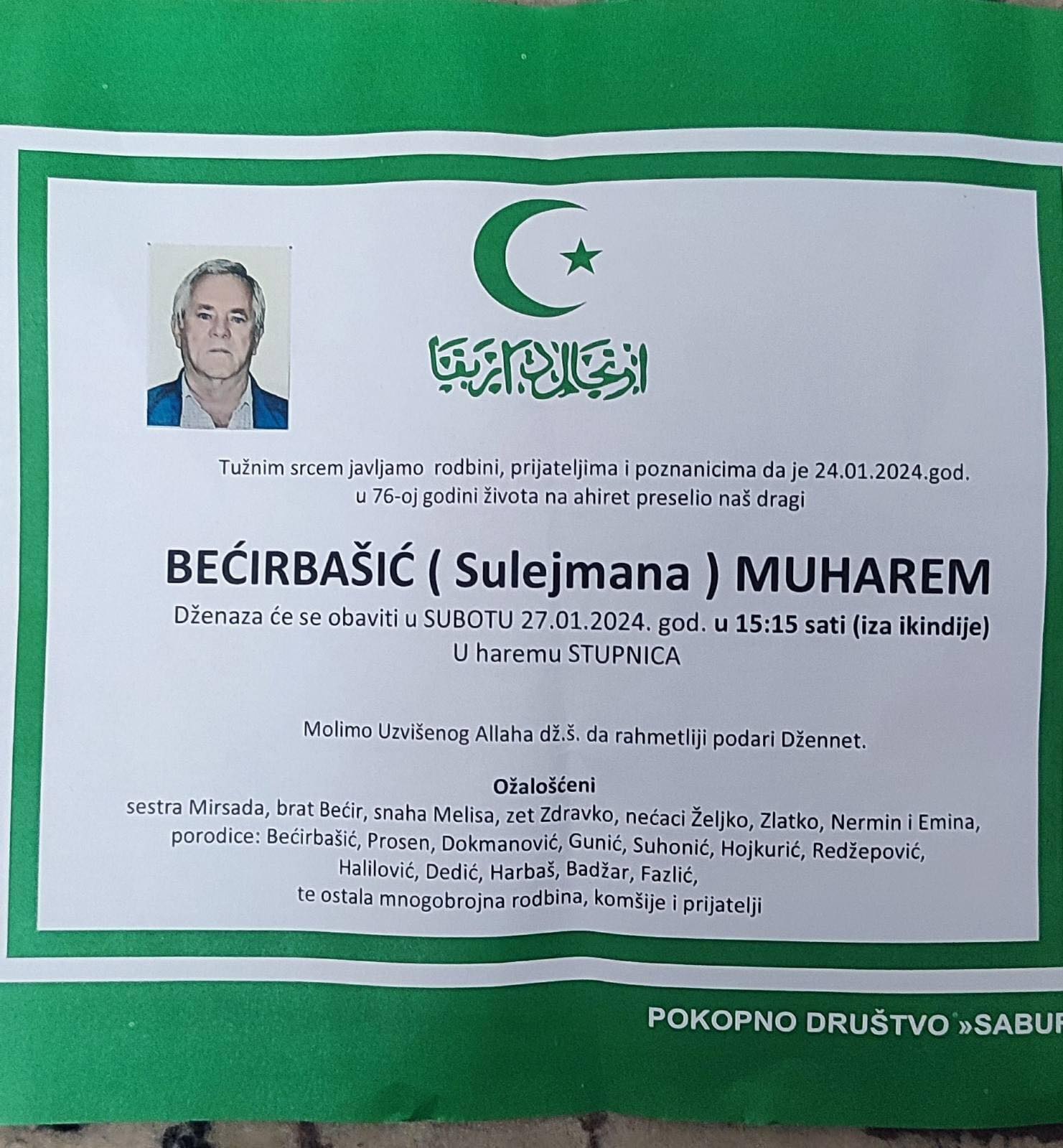 Tuznim srcem javljamo rodbini, prijateljima i poznanicima zalosnu vijest da nam je nas dragi Bećirbašić (Sulejmana) Muharem, dana 24.01.2024 godine u 76-oj godini na Ahiret preselio.