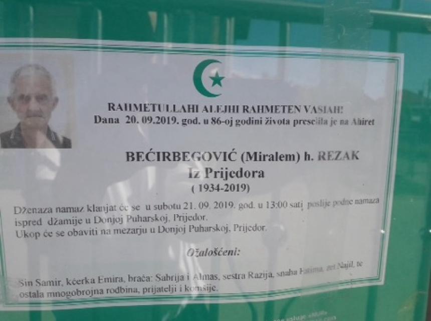 Dana 20.09.2019. god. U 86-oj godini života preselila je na Ahiret Bećirbegović (Miralem) h. Rezak iz Prijedora.