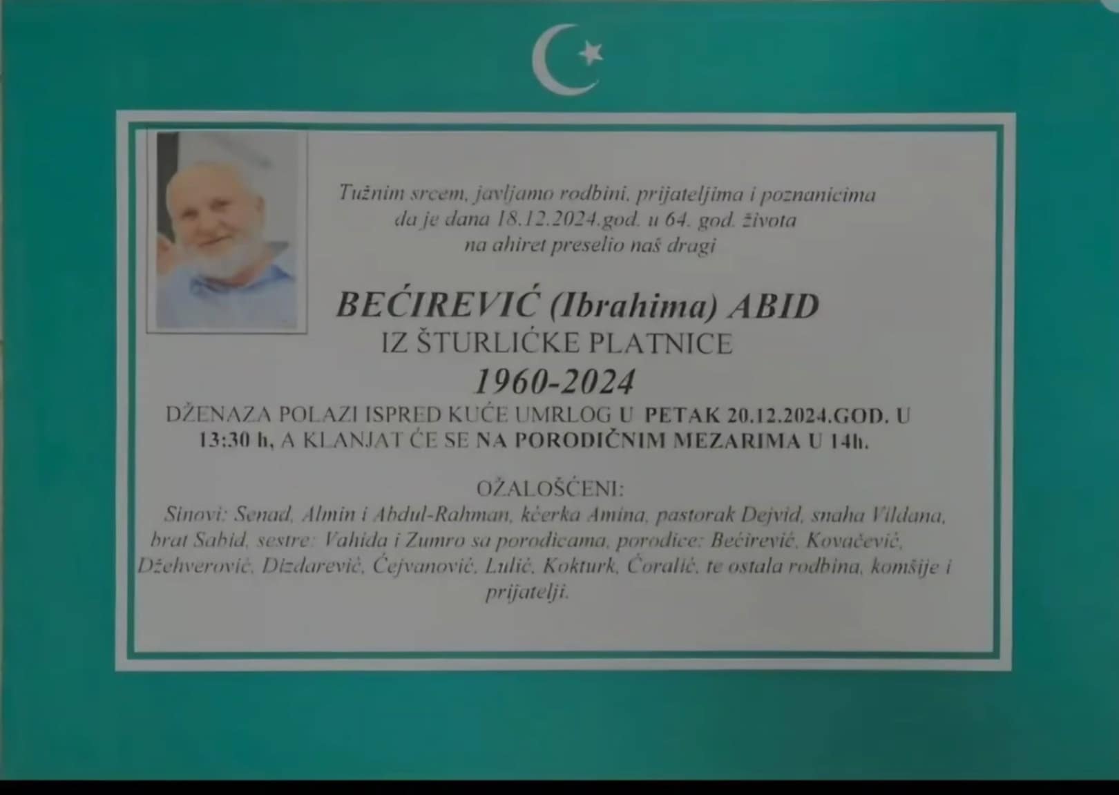 Duboko ožalošćeni obavještavamo rodbinu, prijatelje i komšije da je dana 18.12.2024. godine, iznenada je u 64-oj godini života Bećirević (Ibrahima) Abid preselio na ahiret.