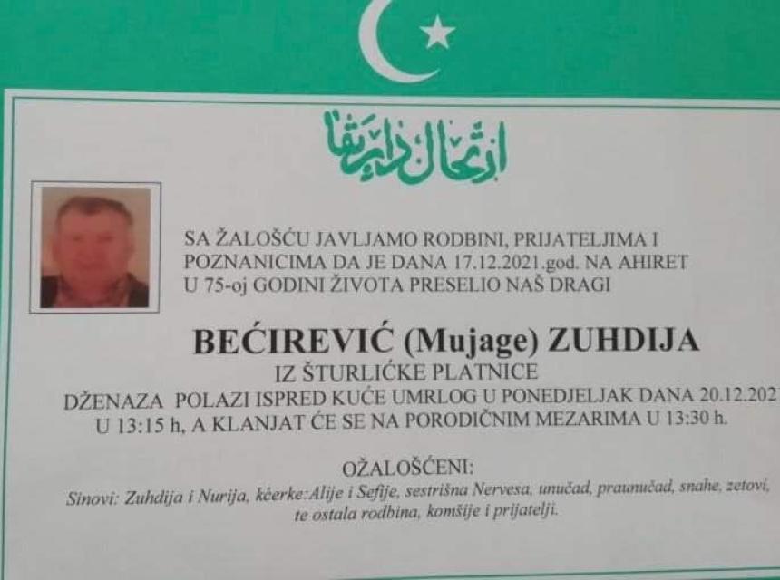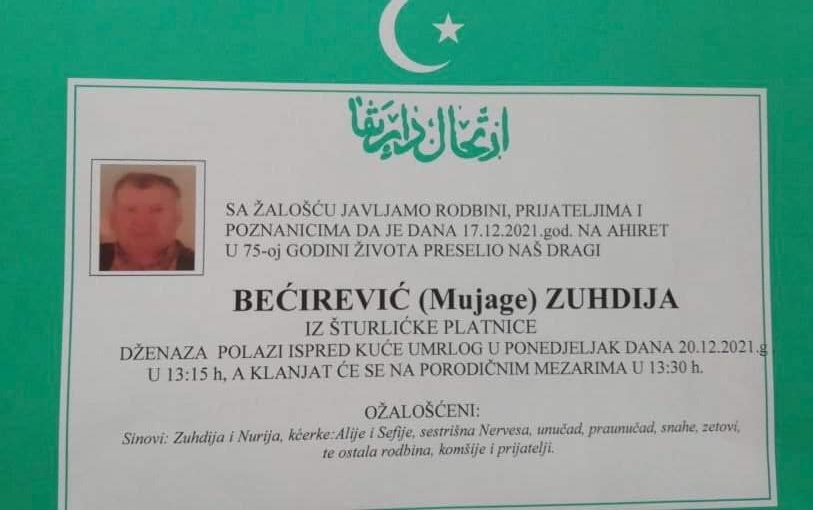 Tužnog srca i s bolom u duši obavještavamo rodbinu, komšije i prijatelje da je naš dragi Bećirević (Mujage) Zuhdija dana 17.12.2021. u 75. godini života preselio na ahiret.