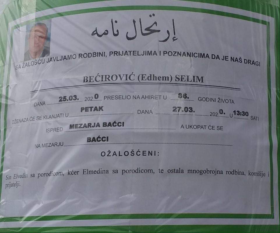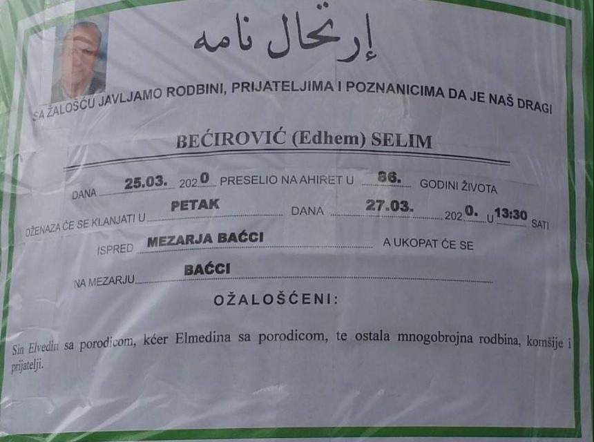 Dženaza namaz će se klanjati u petak 27.03.2020 godine u 13:30 sati ispred mezarja Baćci a ukopat će s na mezarju Baćci.