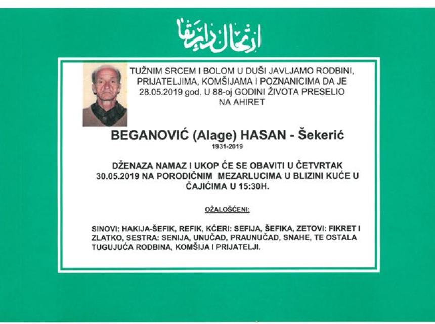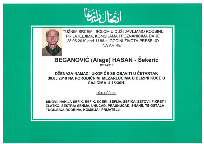 Tužnim srcem i bolom u duši javljamo rodbini, prijateljima, komšijama i poznanicima da je 28.05.2019 god. u 88-oj godini života preselio na ahiret Beganović (Alage) Hasan-Šekerić.