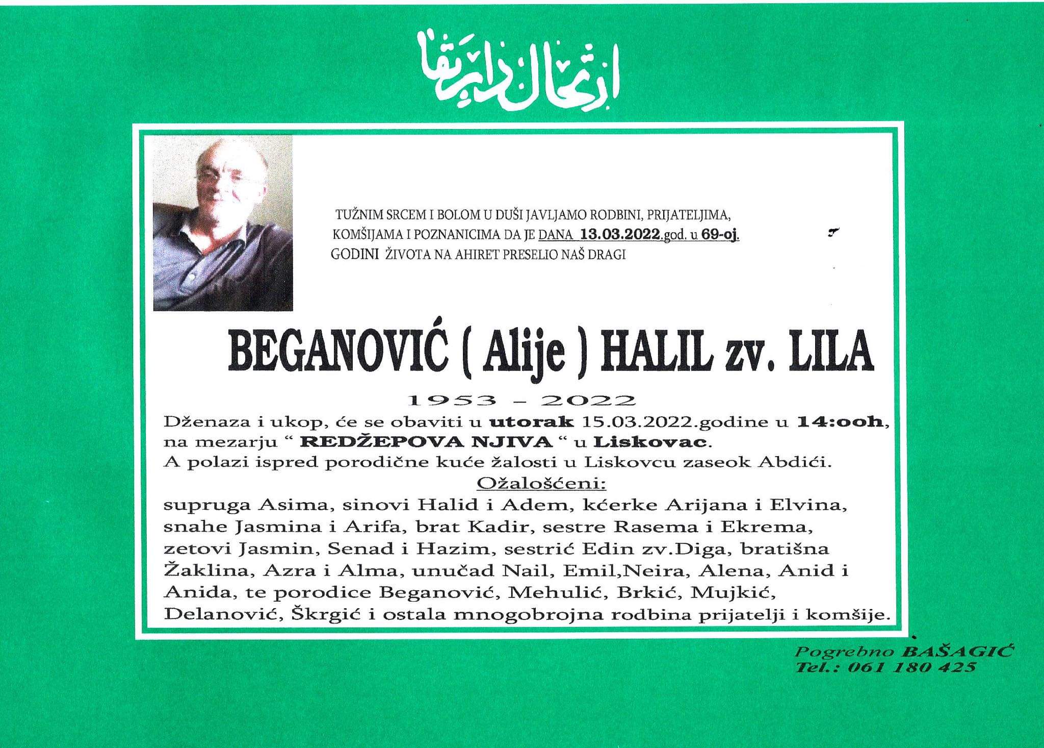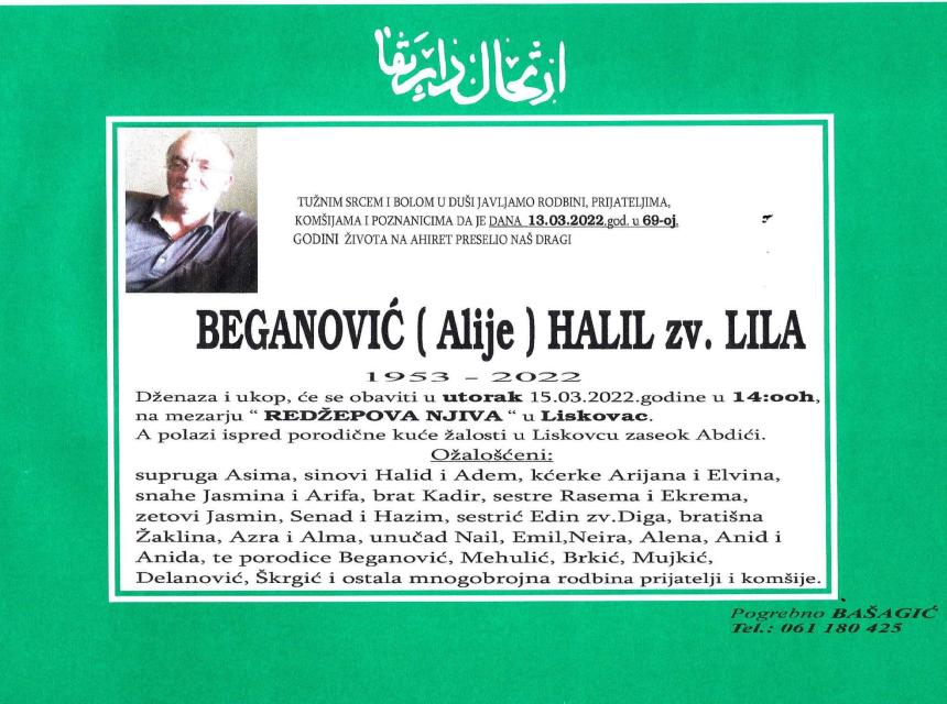 Tužnog srca i s bolom u duši obavještavamo rodbinu, komšije i prijatelje da je naš dragi Beganović (Alije) Halil zv. Lila 13.03.2022. u 69. godini života preselio na Ahiret.