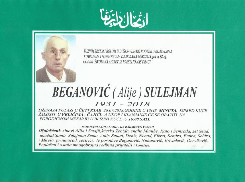 Tužnim srcem i bolom u duši javljamo rodbini, prijateljima, komšijama i poznanicima da je dan 24.07.2018.god. u 88-oj. godini na Ahiret preselio Beganović ( Alije ) Sulejman.
