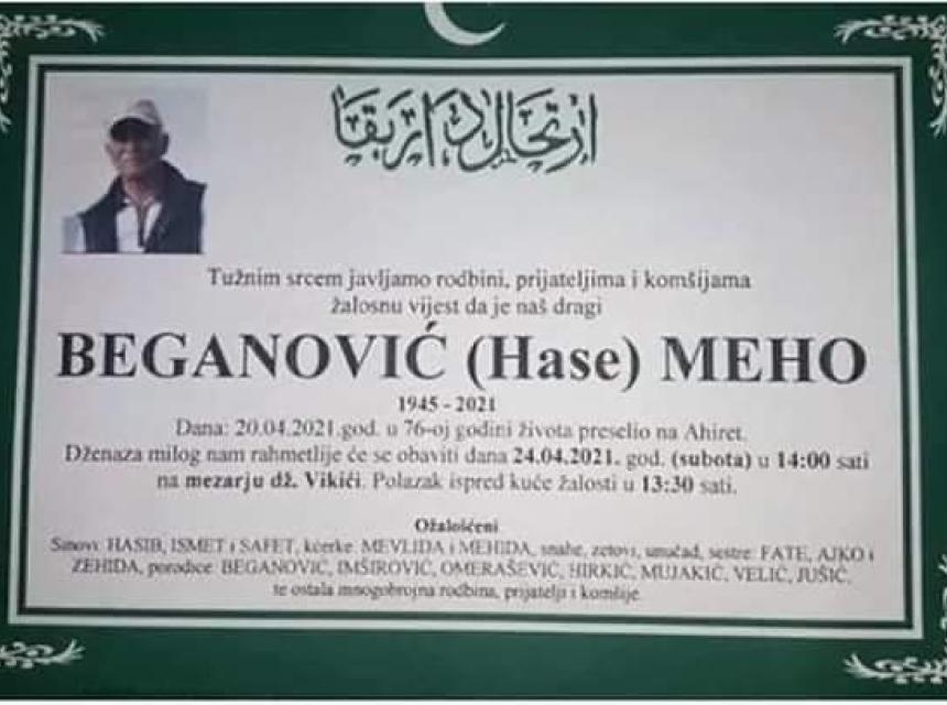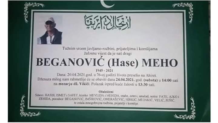 Tužnog srca i s bolom u duši obavještavamo rodbinu, komšije i prijatelje da je naš dragi Beganović (Hase) Meho dana 20.04.2021. god u 76. godini života preselio na ahiret.
