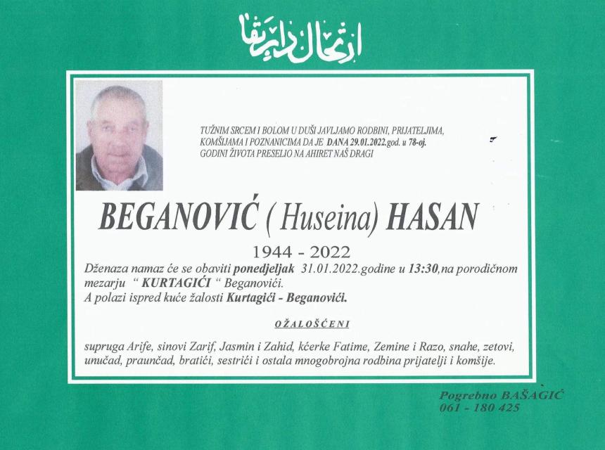 Tužnog srca i s bolom u duši obavještavamo rodbinu, komšije i prijatelje da je naš dragi Beganović (Huseina) Hasan, dana 29.01.2022. godine, u 78-oj godini života, preselio na Ahiret.