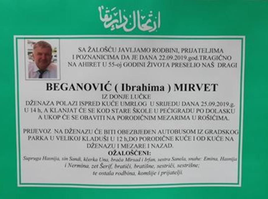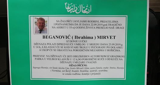 Sa žalošću javljamo rodbini, prijateljima i poznanicima da je dana 22.09.2019. godine trahgično na ahiret u 55-oj godini preselio naš dragi Beganović (Ibrahima) Mirvet iz Donje Lučke.