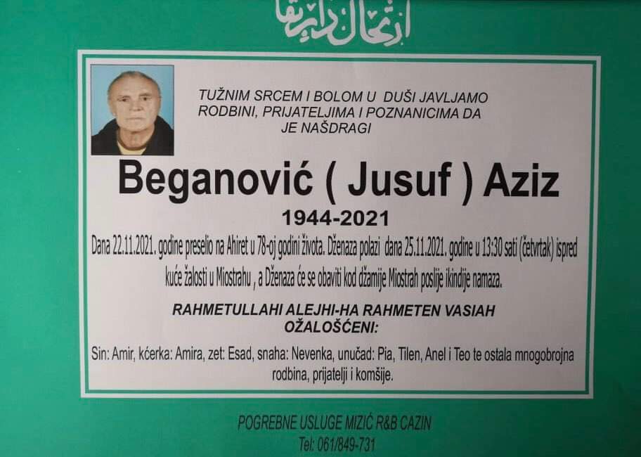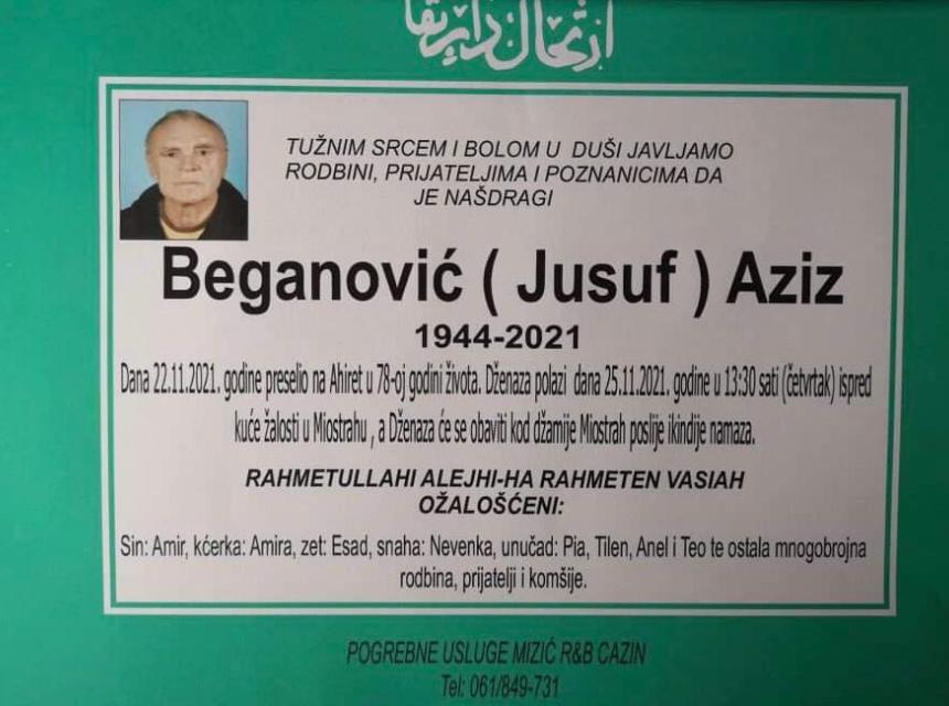 Tužnog srca i s bolom u duši obavještavamo rodbinu, komšije i prijatelje da je naš dragi Beganović (Jusuf) Aziz dana 22.11.2021. u 78. godini života preselio na ahiret.