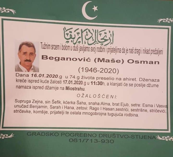 Tužnim srcem i bolom u duši javljamo rodbini i prijateljima da je naš dragi i nikad prežaljeni Beganović (Maše) Osman dana 16.01.2020. godine u 74-toj godini života preselio na Ahiret.