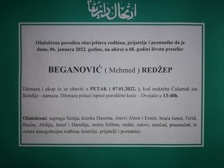 Tužnim srcem i s bolom u duši vas obavještavamo da je naš dragi Beganović (Mehmed) Redžep, dana 06.01.2022. godine, u 68. godini života, preselio na Ahiret.