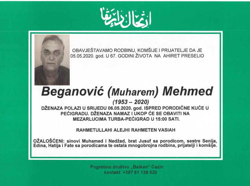 Teškim srcem i bolom u duši javljamo da je naš dragi i nikad prežaljeni Beganović (Muharem) Mehmed dana 05.05.2020.godine u 67-oj godini života preselio na Ahiret.