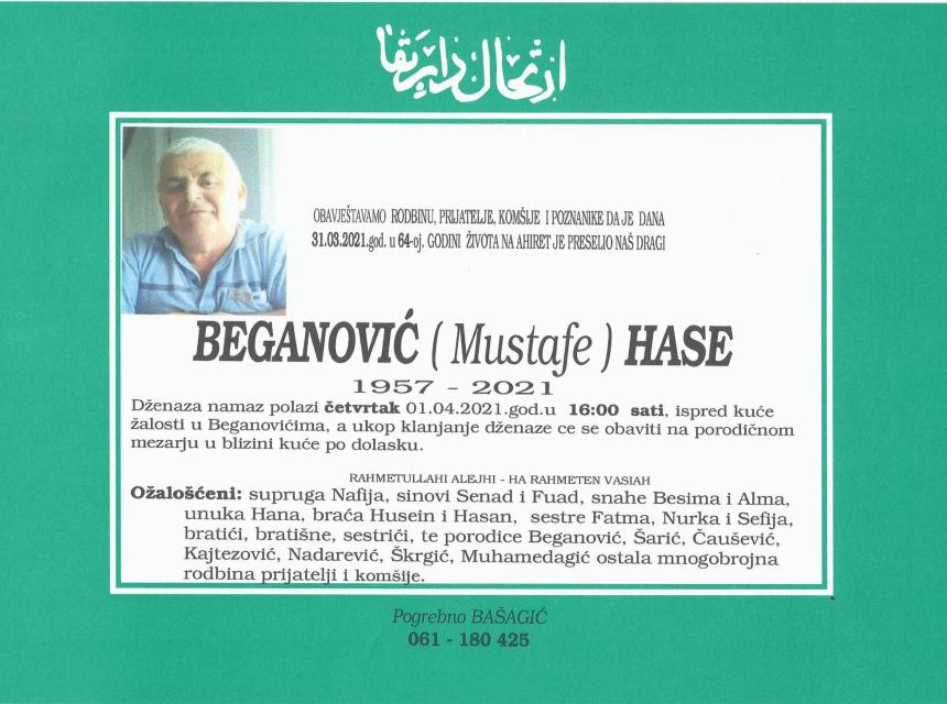 Tužnog srca i s bolom u duši obavještavamo rodbinu, komšije i prijatelje da je naš dragi Beganović (Mustafe) Hase, 31.03.2021. godine, u 64. godini života preselio na Ahiret.