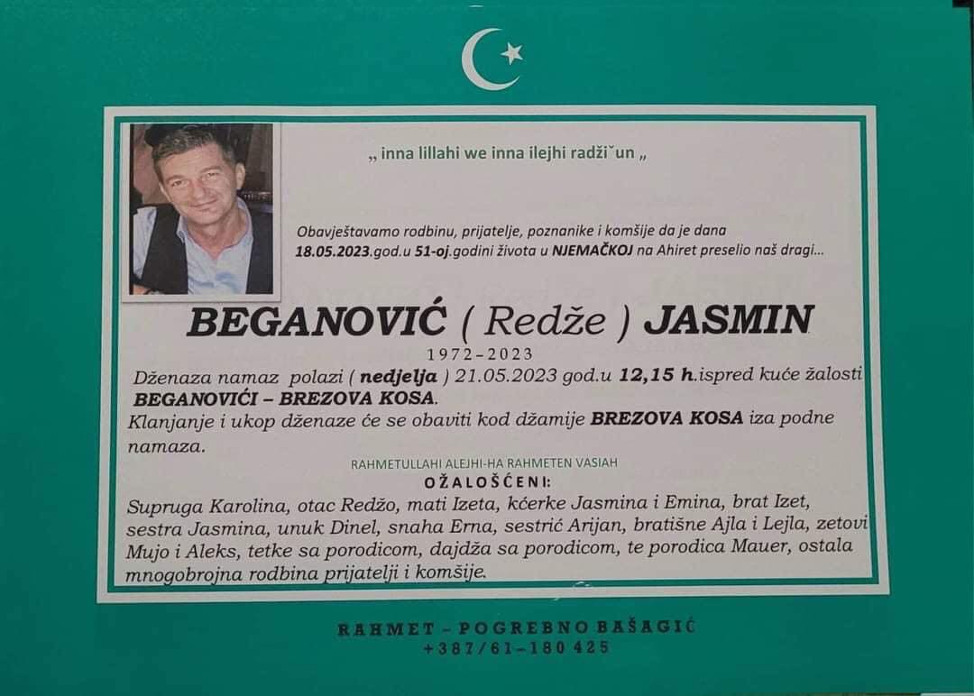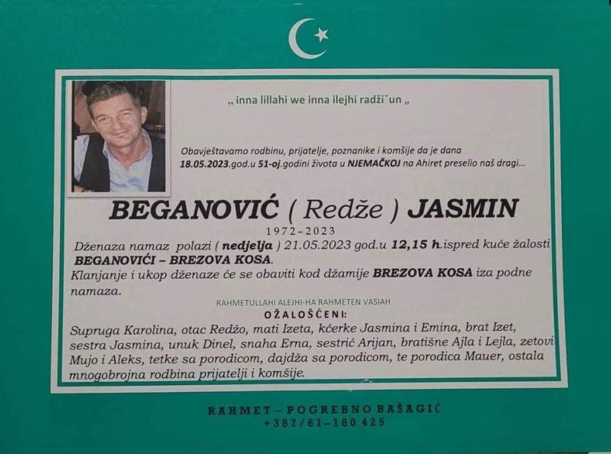 Tužnim srcem i bolom u duši javljamo rodbini, prijateljima i poznanicima da je naš dragi Beganović (Redže) Jasmin dana 18.05.2023. godine u 51-oj godini života, preselio na Ahiret.
