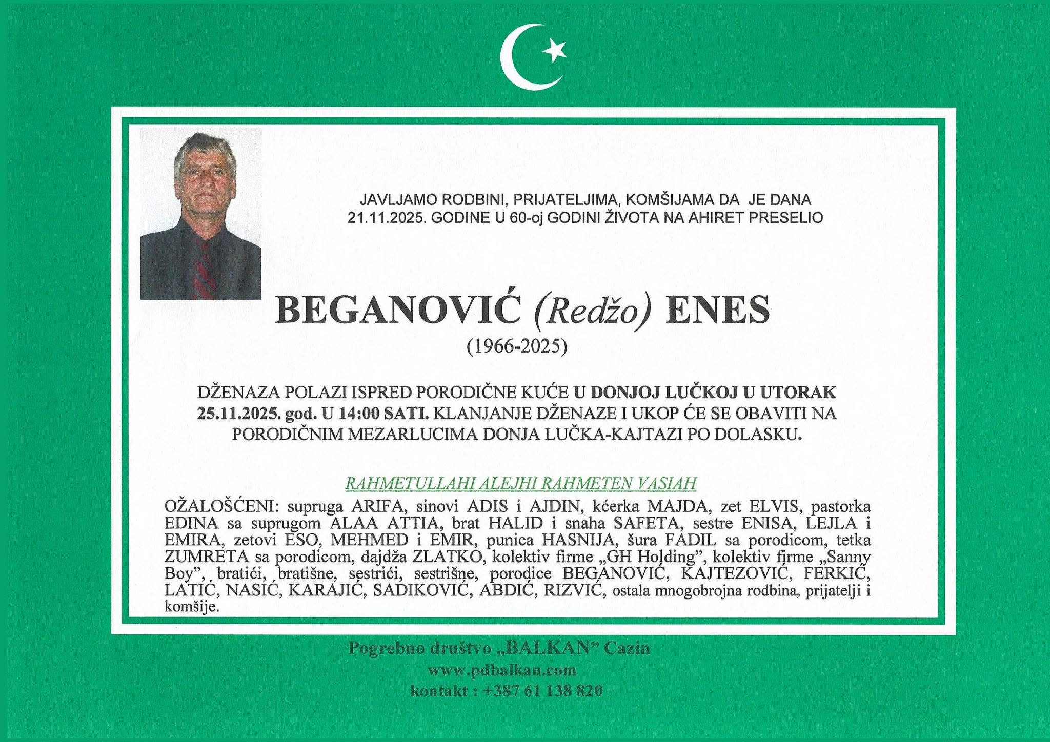 JAVLJAMO RODBINI, PRIJATELJIMA, KOMŠIJAMA DA JE DANA 21.11.2025. GODINE U 60-oj GODINI ŽIVOTA NA AHIRET PRESELIO BEGANOVIĆ (Redžo) ENES.