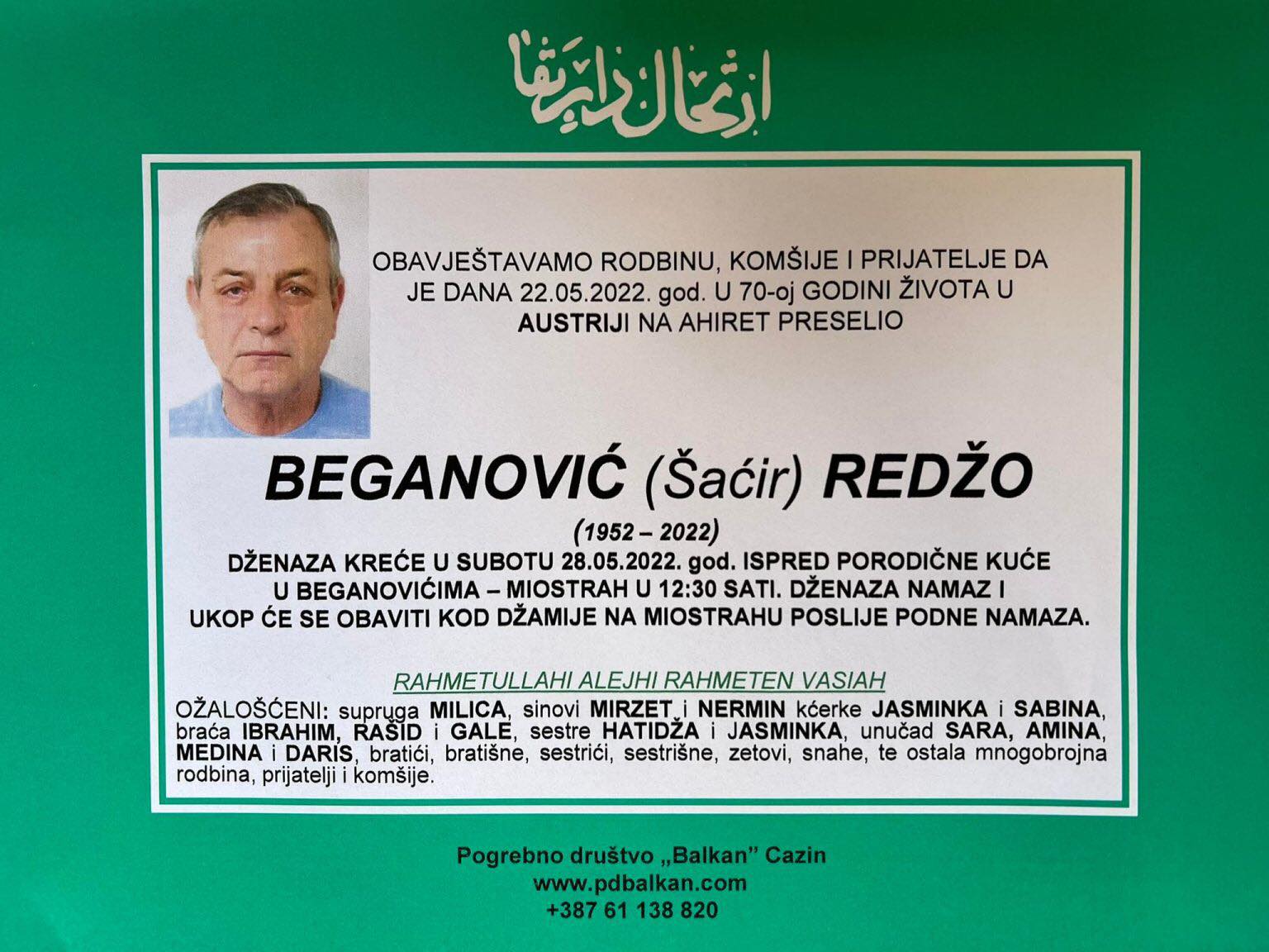Tužnog srca i s bolom u duši obavještavamo rodbinu, komšije i prijatelje da je naš dragi Beganović (Šaćir) Redžo u 70. godini života preselio na Ahiret.