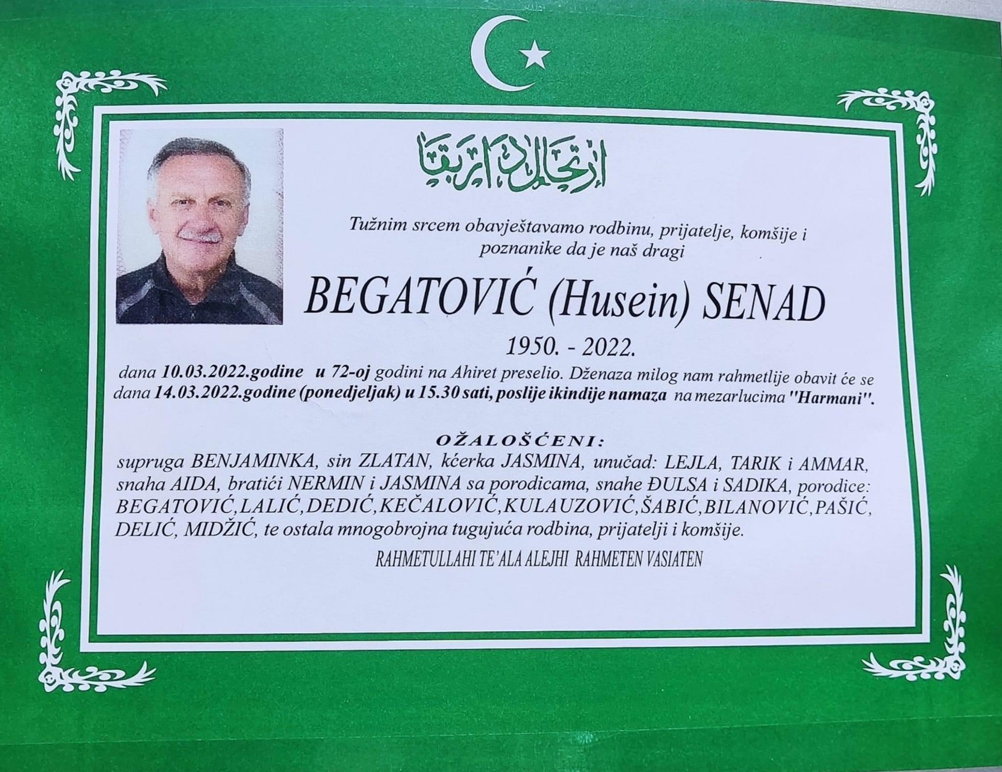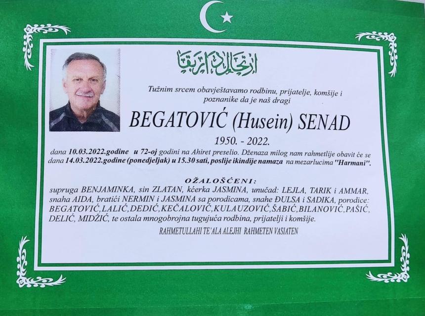 Tužnim srcem i bolom u duši javljamo rodbini, prijateljima i poznanicima da je naš dragi Begatović (Husein) Senad, dana 10.03.2022. godine, u 72-oj godini života, preselio na Ahiret.