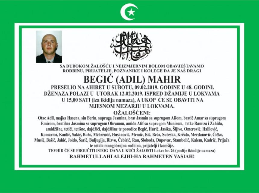 Javljamo rodbini, prijateljima, komšijama i poznanicima da je dana 09.02.2019 tragično na Ahiret preselio Begić (Adil) Mahir u 48 godini.