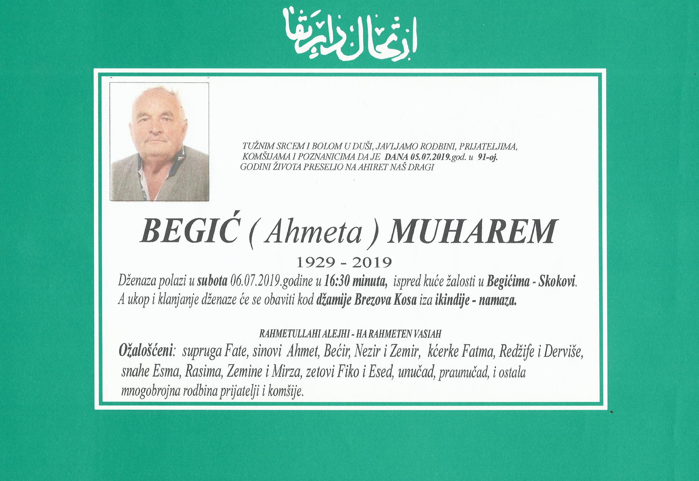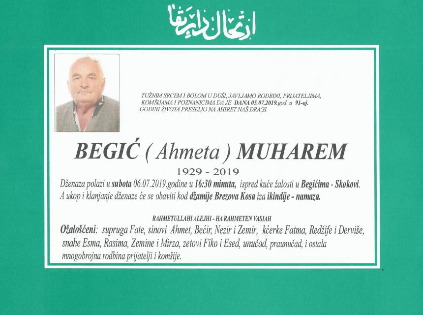 Tužnim srcem i bolom u duši, javljamo rodbini, prijateljima, komšijama i poznanicima da je dana 05.07.2019 god. u 91-oj . godini života preselio na Ahiret naš dragi Begić (Ahmeta) Muharem.