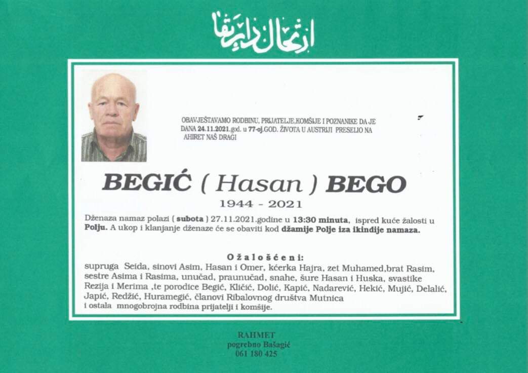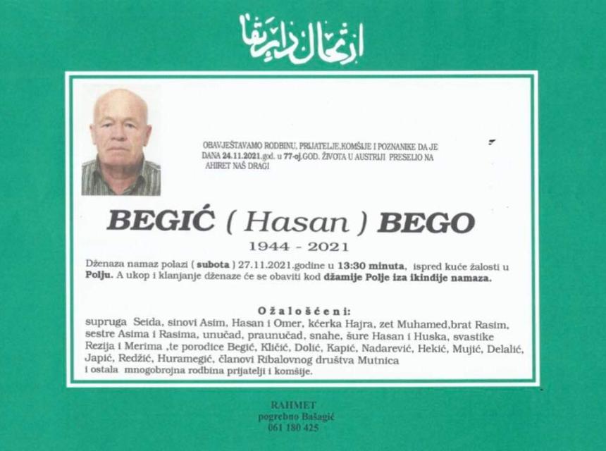 Tužnog srca i s bolom u duši obavještavamo rodbinu, komšije i prijatelje da je naš dragi Begić (Hasan) Bego dana 24.11.2021. u 77. godini života preselio na ahiret.