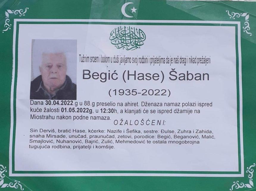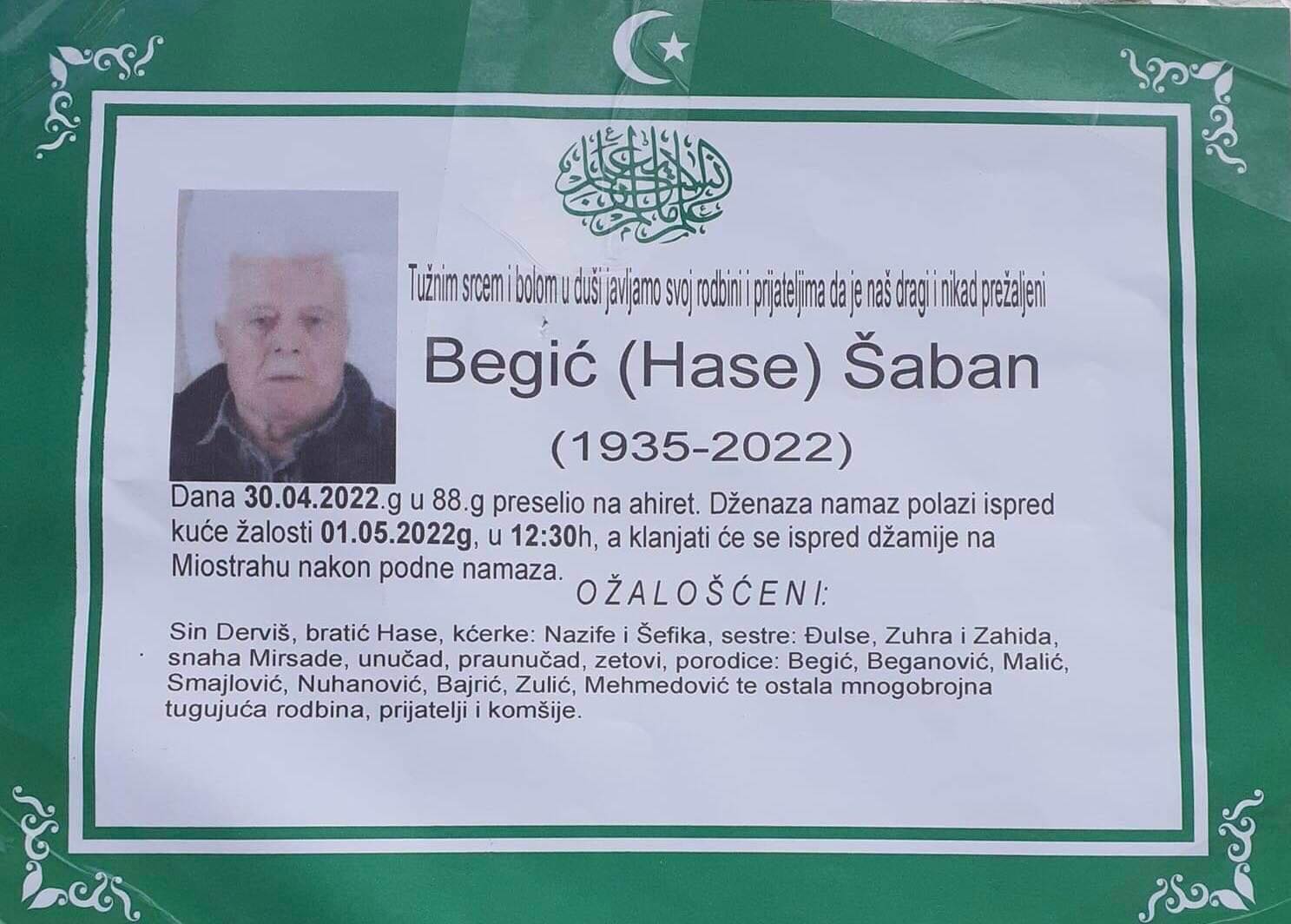 Tužnog srca i s bolom u duši obavještavamo rodbinu, komšije i prijatelje da je naš dragi Begić (Hase) Šaban, dana 30.04.2022. godine u 88-oj godini života, preselio na Ahiret.