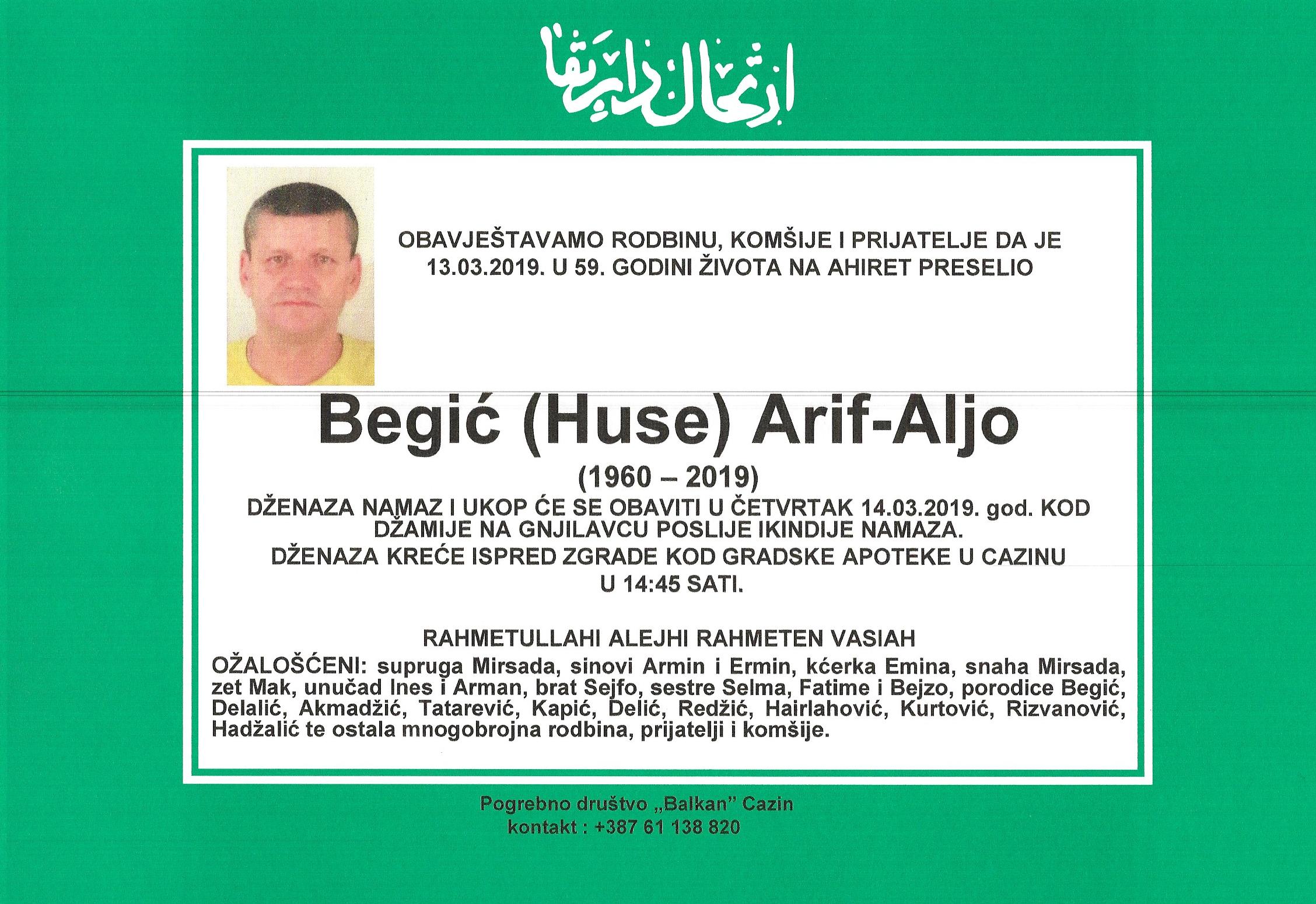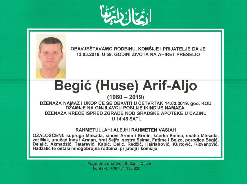 Tužnim srcem javljamo rodbini, prijateljima i komšijama da je naš dragi Begić (Huse) Arif-Aljo dana 13.03.2019. godine u 59-oj godini života preselio na Ahiret.