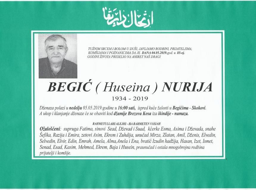 Tužnim srcem i bolom u duši javljamo rodbini, prijateljima, komšijama i poznanicima da je dana 04.05.2019. godine u 85.-oj godini života na Ahiret preselio naš dragi Begić (Huseina) Nurija.