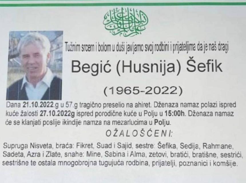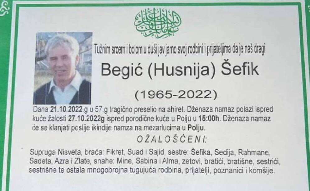 Tužnog srca i s bolom u duši obavještavamo rodbinu, komšije i prijatelje da je naš dragi Begić (Husnija) Šefik dana 21.10.2022. godine, u 57-oj godini života, preselio na Ahiret.