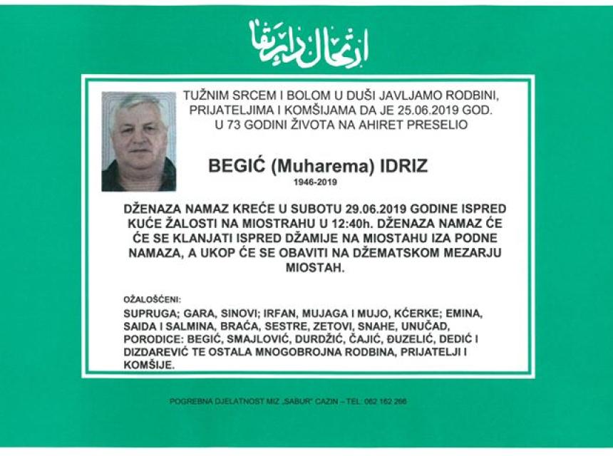 Tužnim srcem javljamo rodbini, prijateljima i poznanicima žalosnu vijest da nam je naš dragi Begić (Muharema) Idriz dana 25.06.2019. godine nakon duge i teške bolesti u 73-oj godini na Ahiret preselio.