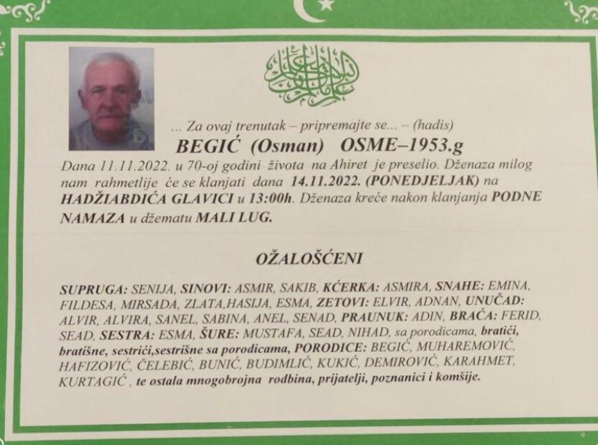 Tužnog srca i s bolom u duši obavještavamo rodbinu, komšije i prijatelje da je naš dragi Begić (Osman) Osme u 70. godini života preselio na Ahiret.