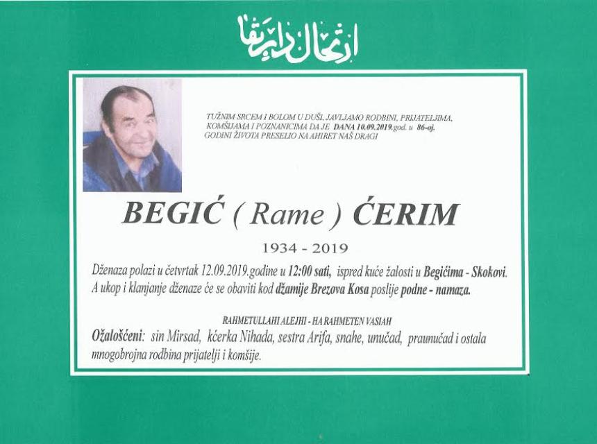 Tužnim srcem i bolom u duši, javljamo rodbini, prijateljima, komšijama i poznanicima da je dana 10.09.2019.god.u 86-oj. godini života preselio na Ahiret naš dragi Begić (Rame) Ćerim.