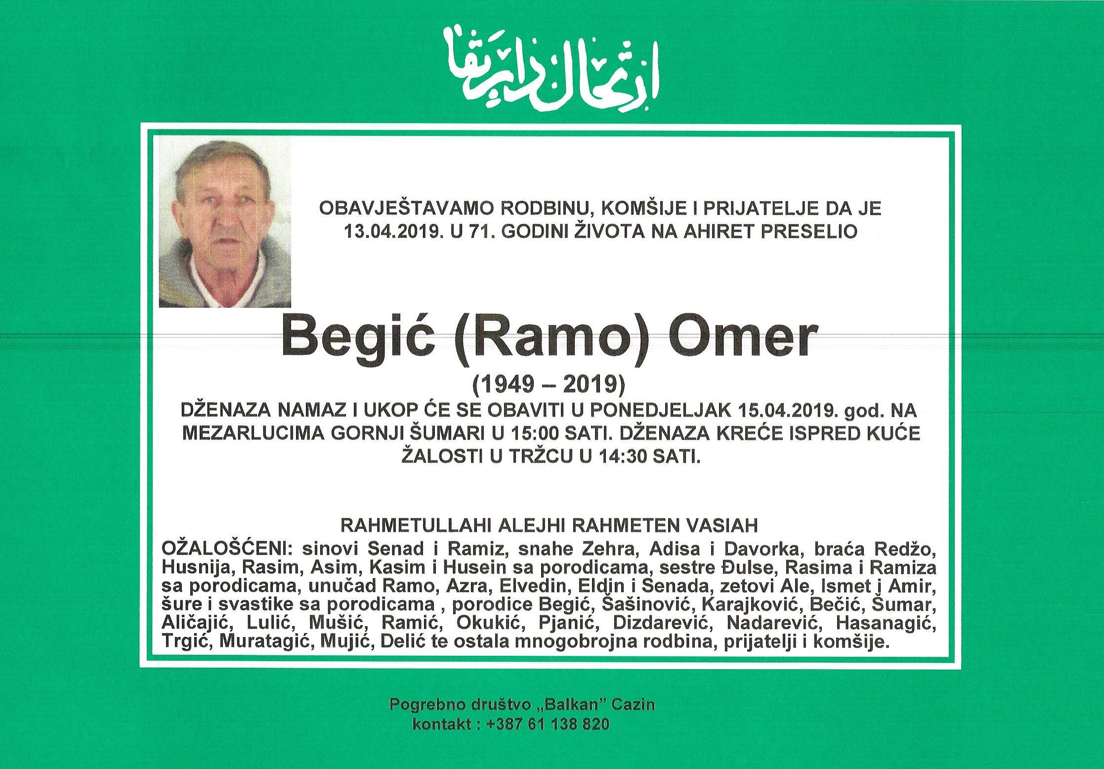 Obavještavamo rodbinu, prijatelje i komšije da je dana 13.04.2019. godine u 71-oj godini života na Ahiret preselio naš dragi Begić (Ramo) Omer.