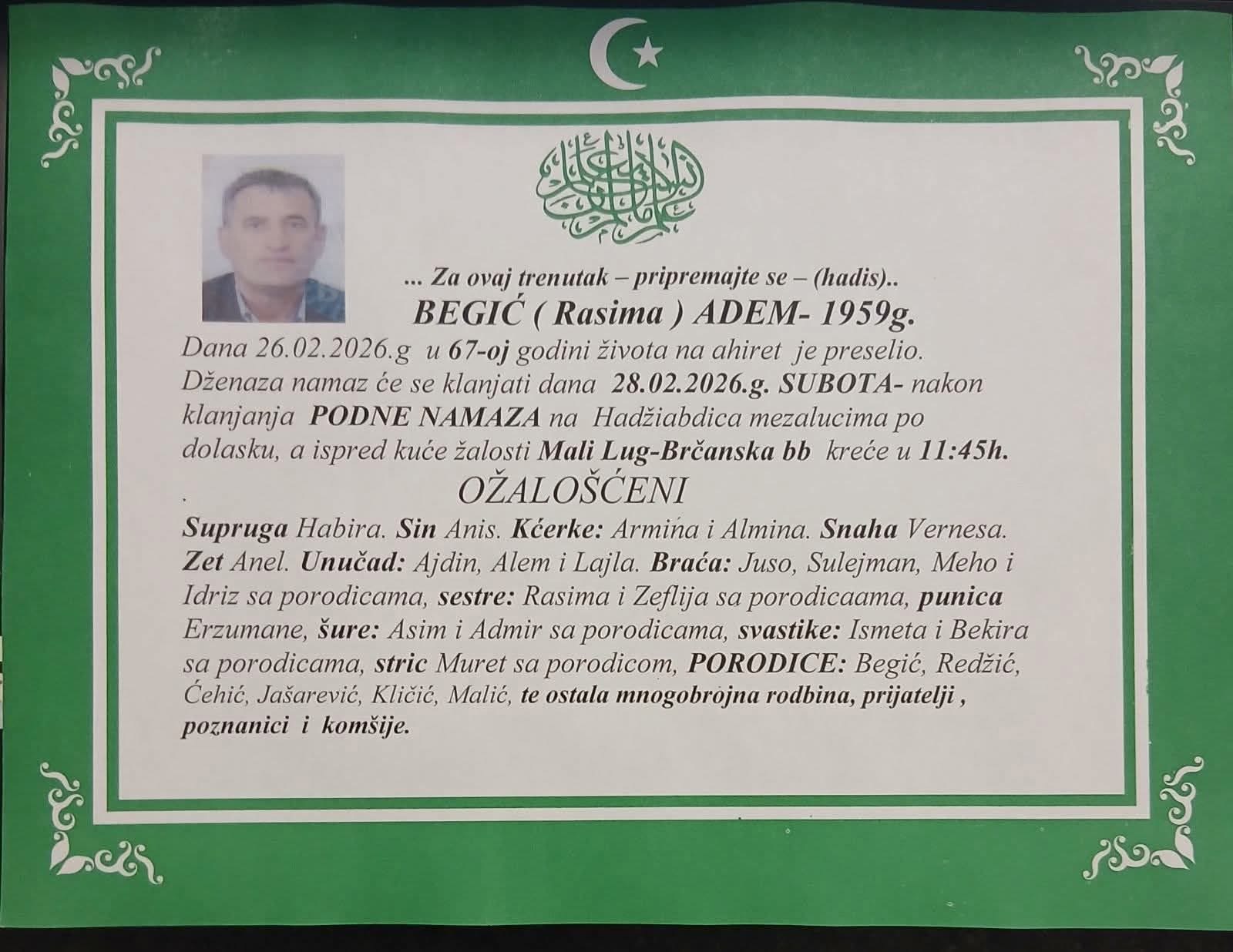 Dženaza-namaz će se klanjati u subotu, 28. 02. 2026. godine, nakon podne-namaza na Hadžiabdića mezarlucima po dolasku, a ispred kuće žalosti (Mali Lug – Brčanska bb) polazak je u 11:45 sati.