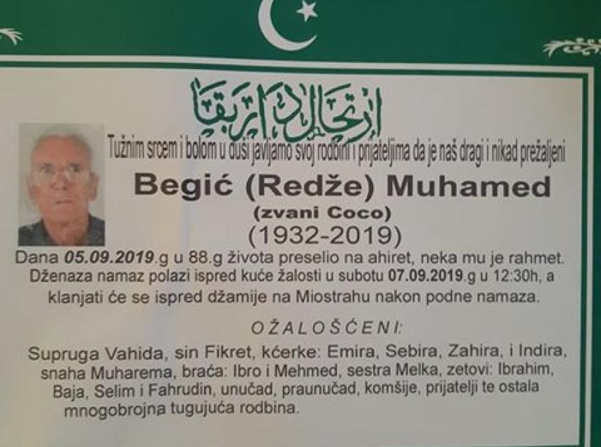 Tužnim srcem i bolom u duši javljamo svoj rodbini i prijateljima da je naš dragi i nikad prežaljeni Begić (Redže) Muhamed dana 05.09.2019.g. u 88.g života preselio na Ahiret, neka mu je rahmet. Dženaza namaz polazi ispred kuće žalosti u subotu 07.09.2019.g u 12:30h, a klanjati će se ispred džamije na Miostrahu nakon podne namaza.