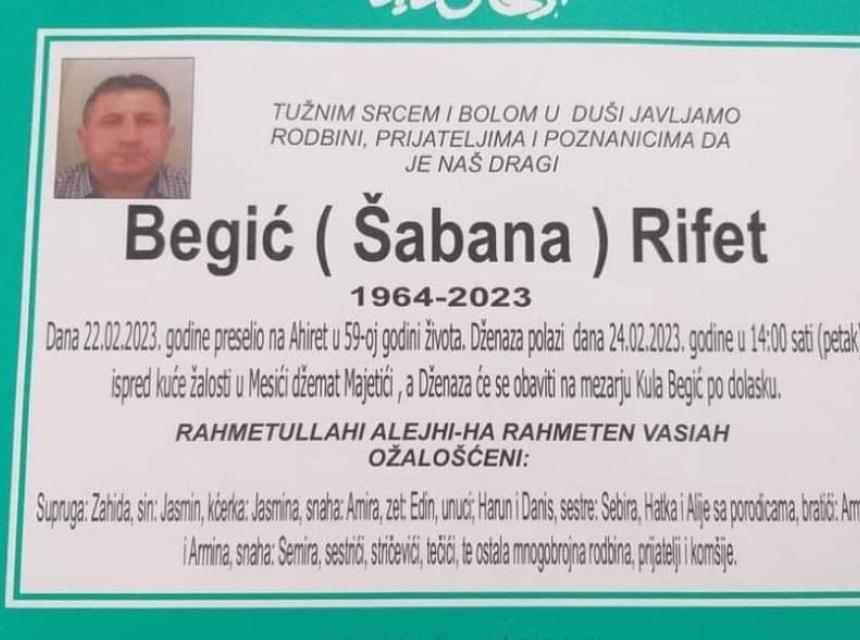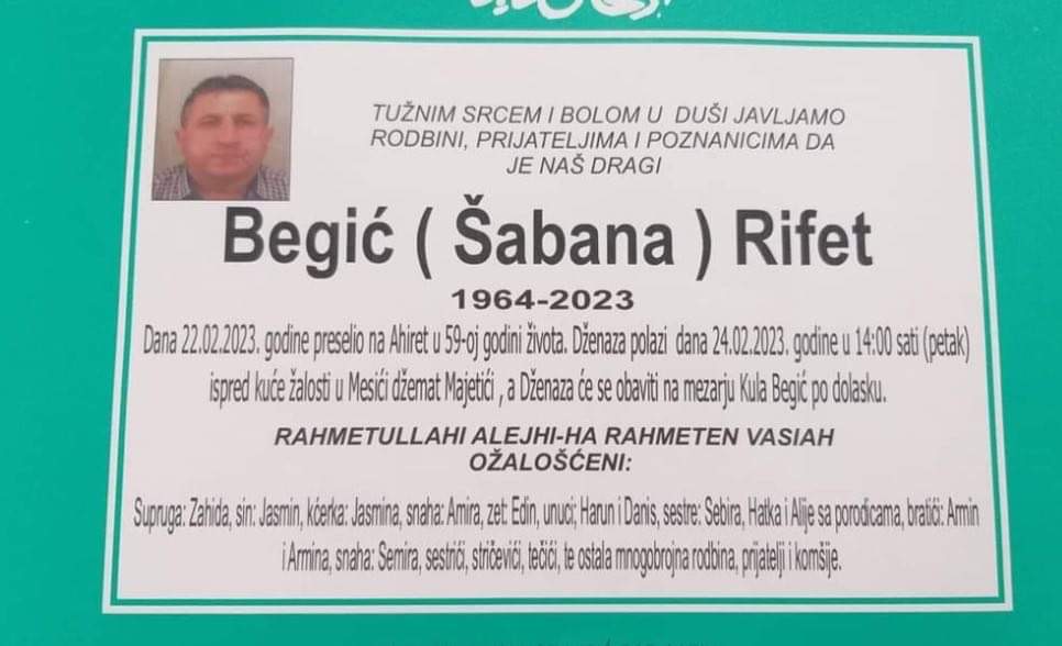 Tužnog srca i s bolom u duši obavještavamo rodbinu, komšije i prijatelje da je naš dragi Begić (Šabana) Rifet, dana 22.02.2023 godine na ahiret preselio u 59-oj godini života.