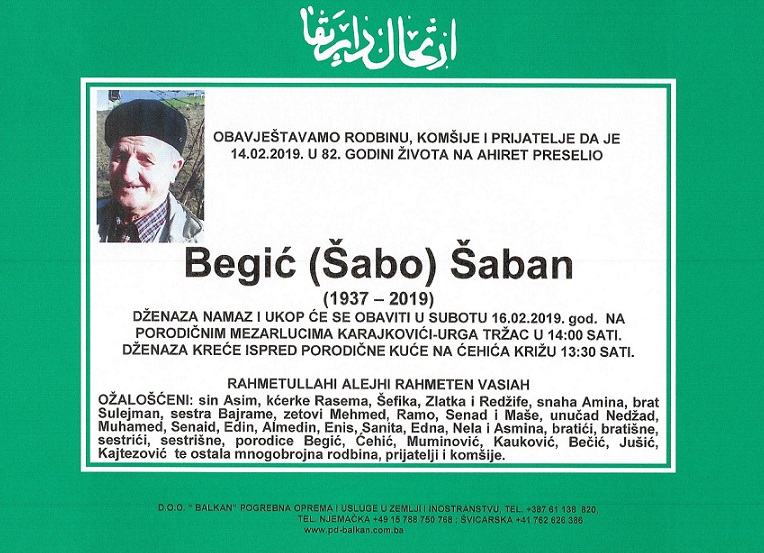 Obavještavamo rodbinu, komšije i prijatelje da je dana 14.02.2019.g. u 82.-oj godini života na Ahiret preselio Begić (Šabo) Šaban.