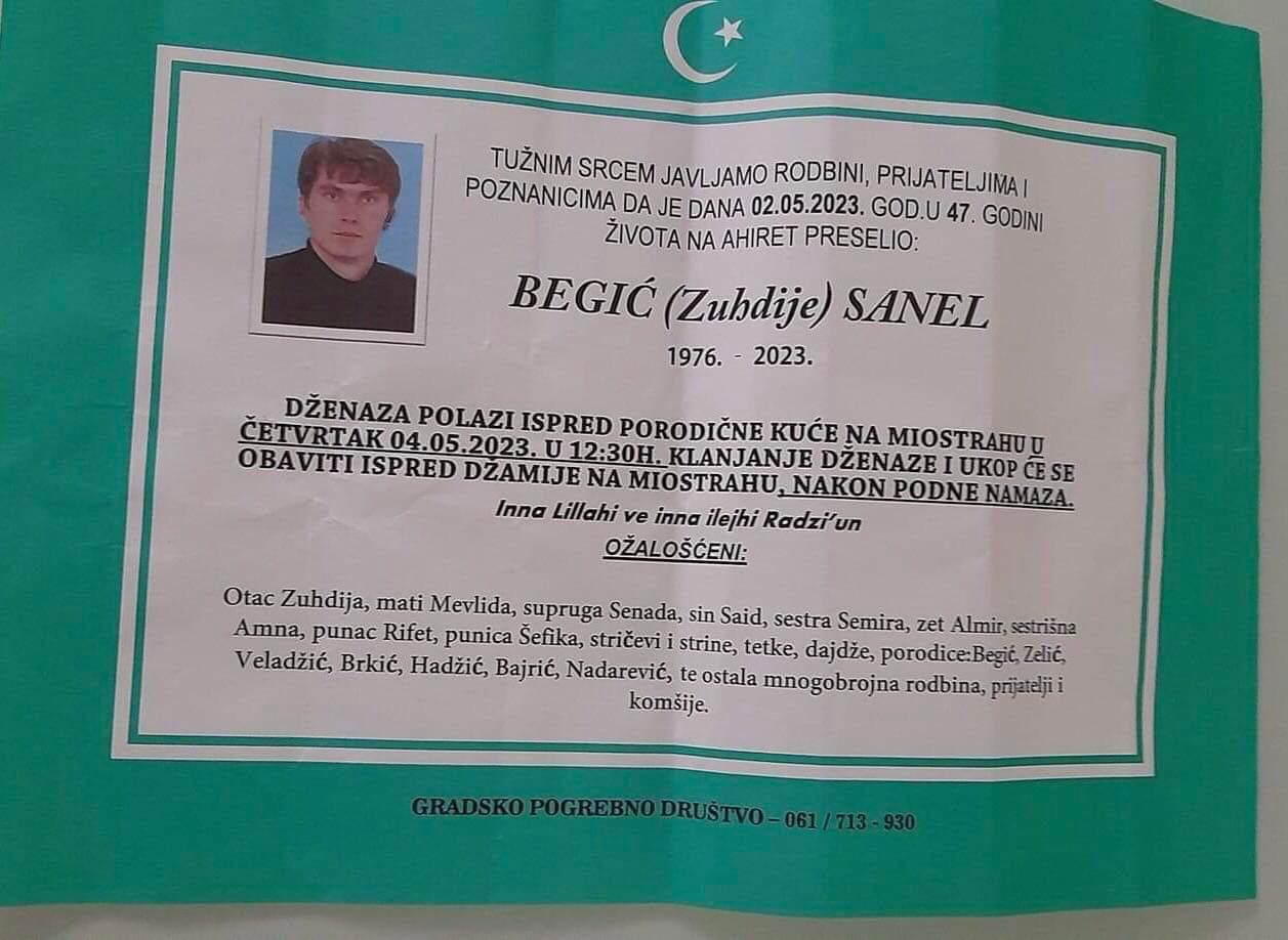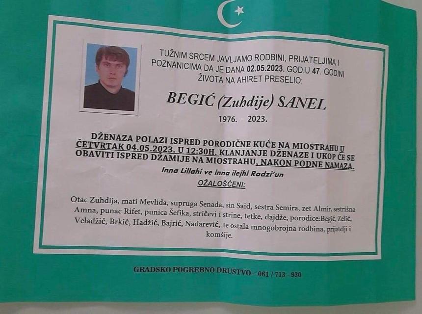 Obavještavamo rodbinu, prijatelje i komšije da je dana 02.05.2023. godine u 47-oj godini života na Ahiret preselio Begić Zuhdije) Sanel.