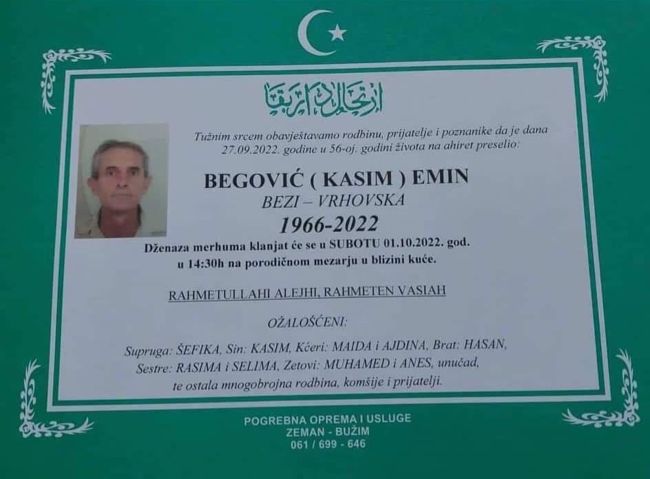 Tužnog srca i s bolom u duši obavještavamo rodbinu, komšije i prijatelje da je naš dragi Begović (Kasim) Emin, dana 27.09.2022. godine, u 56-oj godini života, preselio na Ahiret.