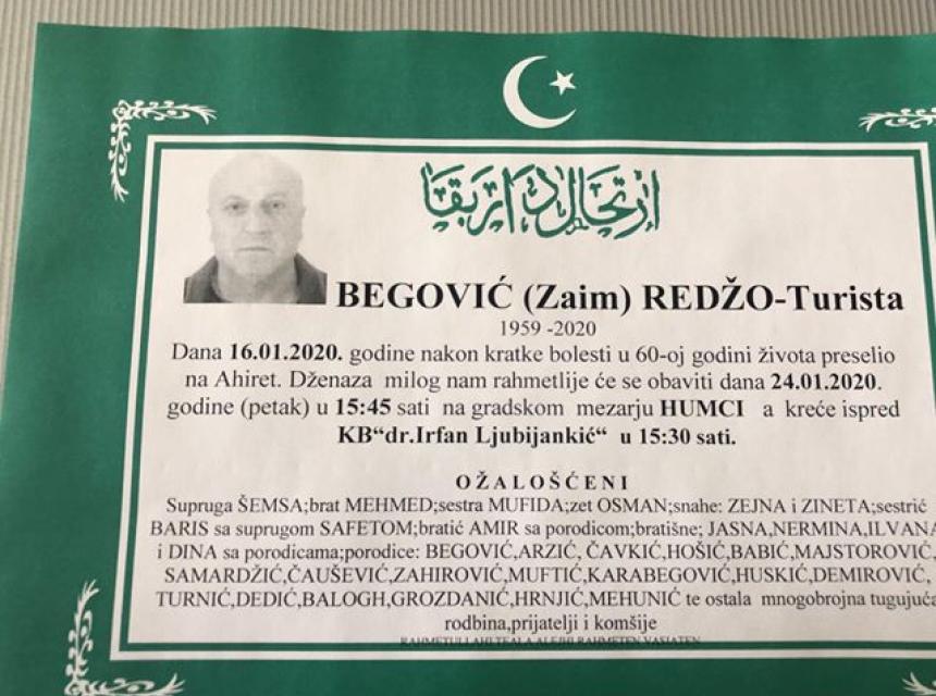 Begović (Zaim) Redžo-Turista dana 16.01.2020. godine nakon kratke bolesti u 60-oj godini života preselio na Ahiret.