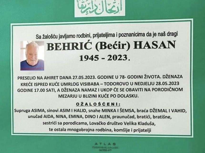Tužnim srcem i bolom u duši javljamo rodbini, prijateljima i poznanicima da je naš dragi Behrić (Bećir) Hasan, dana 27.05.2023. godine u 78-oj godini života, preselio na Ahiret.