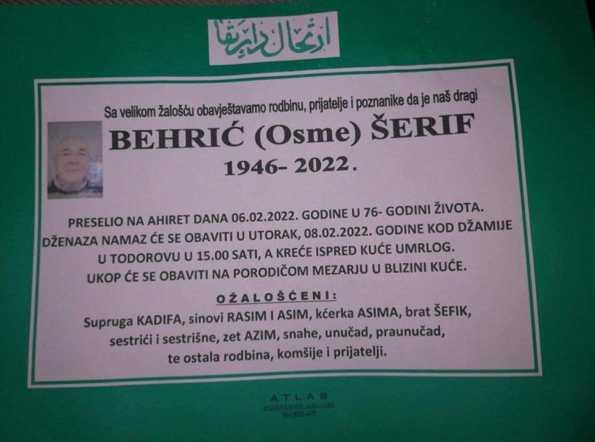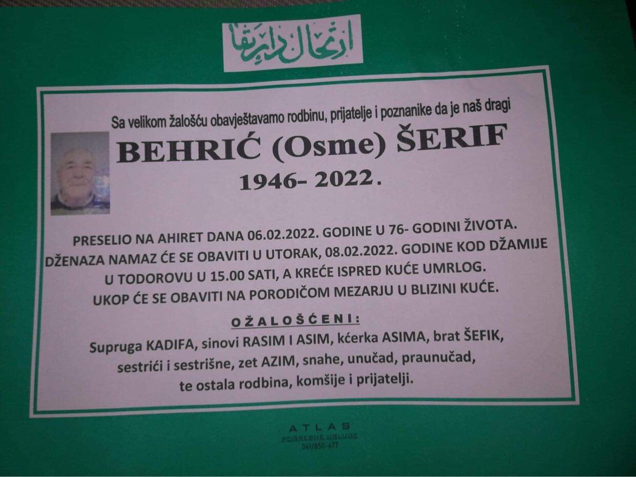 Tužnog srca i s bolom u duši obavještavamo rodbinu, komšije i prijatelje da je naš dragi Behrić (Osme) Šerif 06.02.2022. u 76. godini života preselio na ahiret.