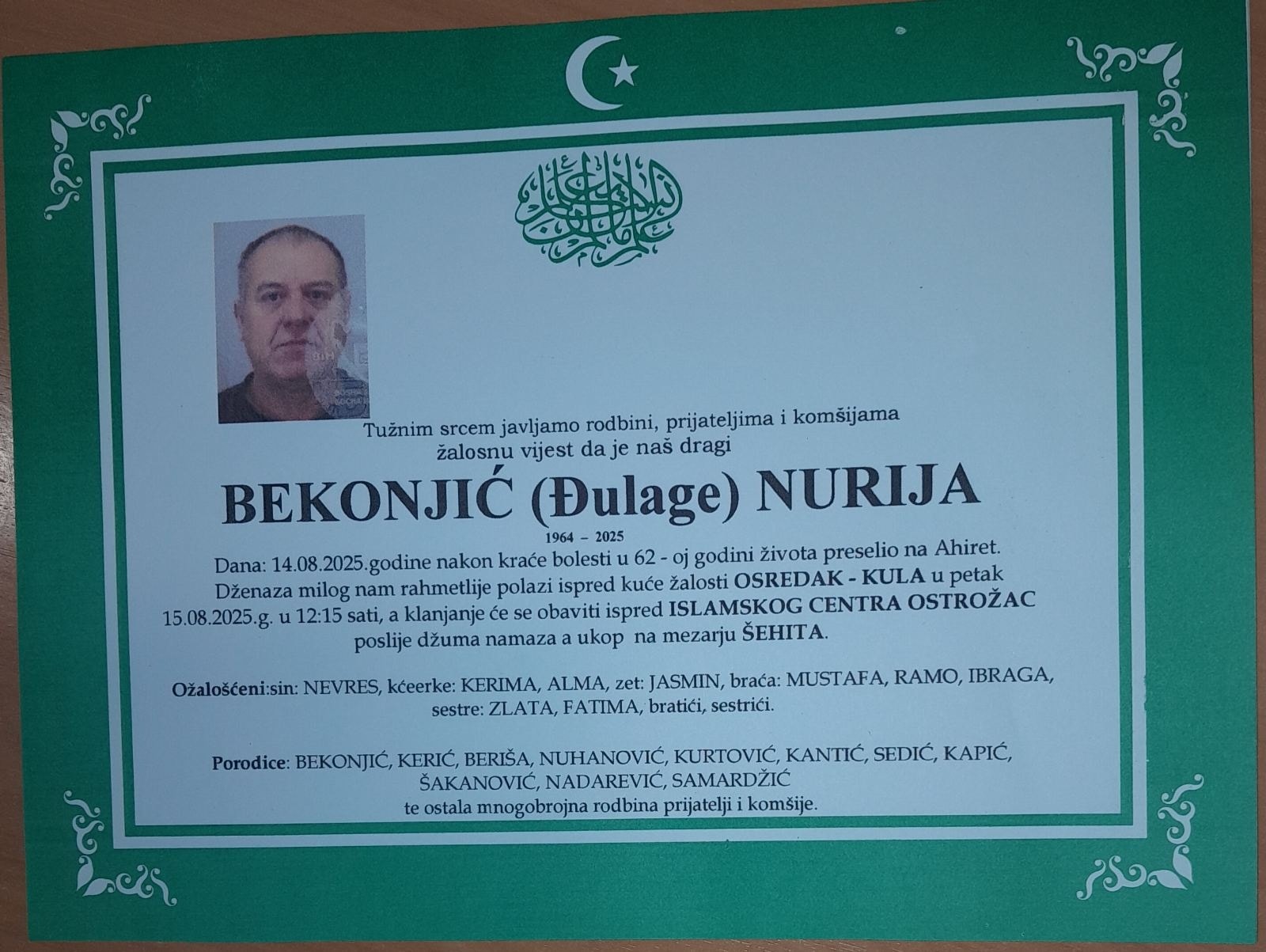 Dženaza milog nam rahmetlije polazi ispred kuće žalosti OSREDAK – KULA u petak 15.08.2025. u 12:15 sati, a klanjanje će se obaviti ispred ISLAMSKOG CENTRA OSTROŽAC poslije džuma namaza i ukop na mezarju ŠEHITA.