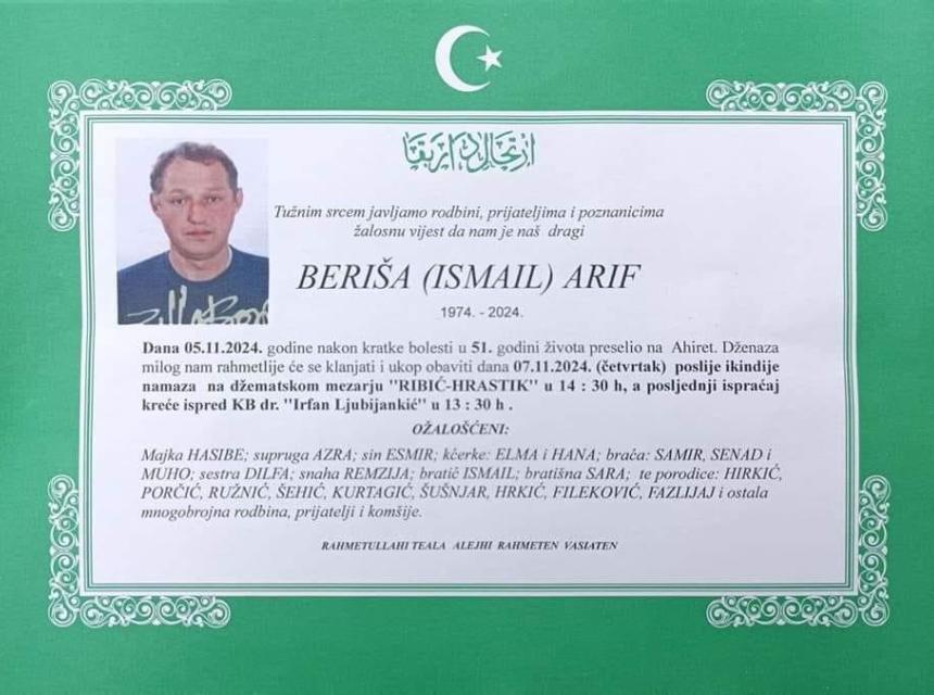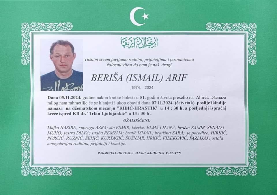 Obavještavamo rodbinu i prijatelje da je 05.11.2024. u 51. godini na ahiret preselio Beriša (Ismail) Arif.