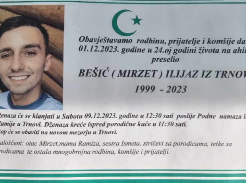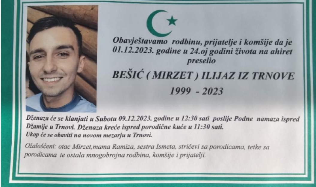Obavještavamo rodbinu, prijatelje i komšije da je 01.12.2023. godine u 24.oj godini života na Ahiret preselio BEŠIĆ (MIRZET) ILIJAZ IZ TRNOVE.