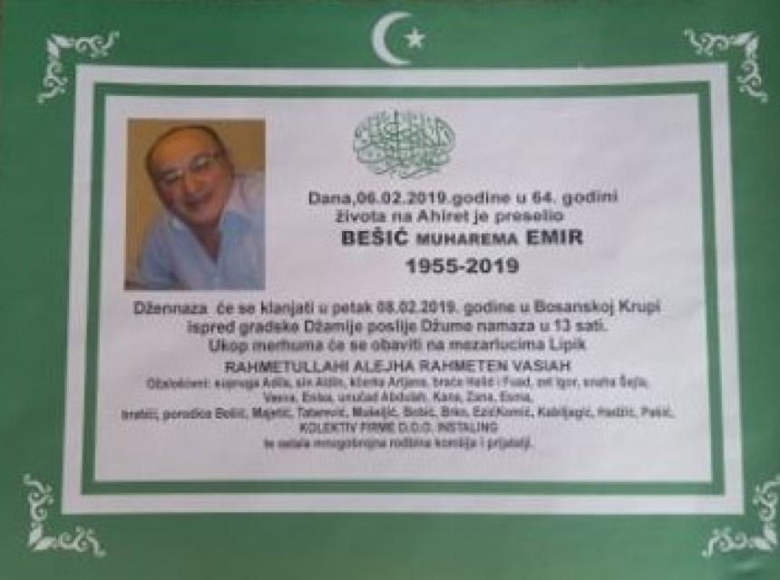 Dženaza namaz će se obaviti 08.02.2019. u Bosanskoj Krupi, ispred gradske džamije, poslije džuma namaza u 13h, a ukop na na mezarlucima Lipik.