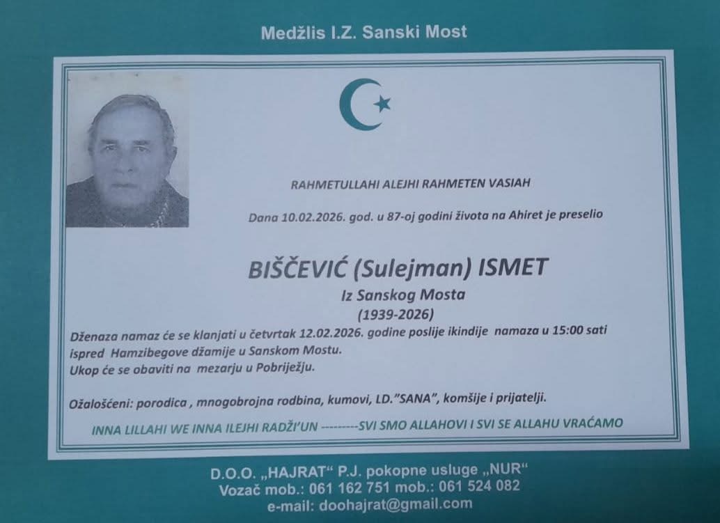 Dženaza-namaz će se klanjati u četvrtak, 12.02.2026. godine, poslije ikindije-namaza u 15:00 sati, ispred Hamzibegove džamije u Sanskom Mostu.