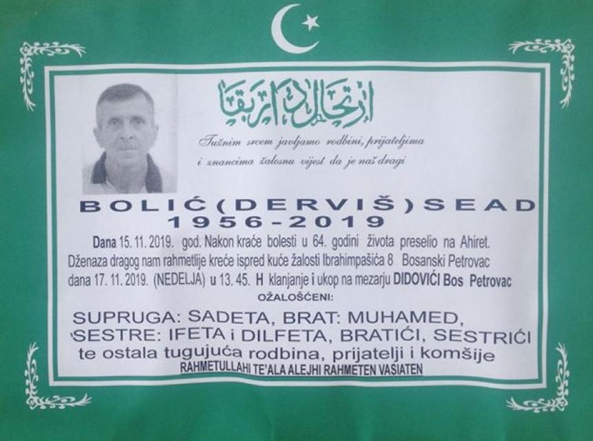 Tužnim srcem i bolom u duši javljamo rodbini, prijateljima, komšijama i poznanicima da je dana 15.11.2019 god. U 64-oj, godini života na Ahiret preselio naš dragi Bolić (Derviš) Sead.