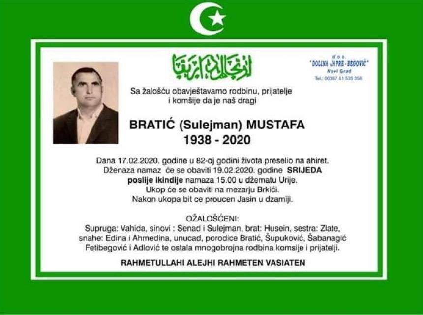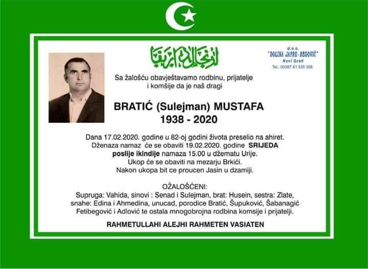 Tužnog srca, s bolom u duši obavještavamo rodbinu, komšije i prijatelje da je naš dragi Bratić (Sulejman) Mustafa, dana 17.02.2020.godine preselio na Ahiret u 82. godini života.