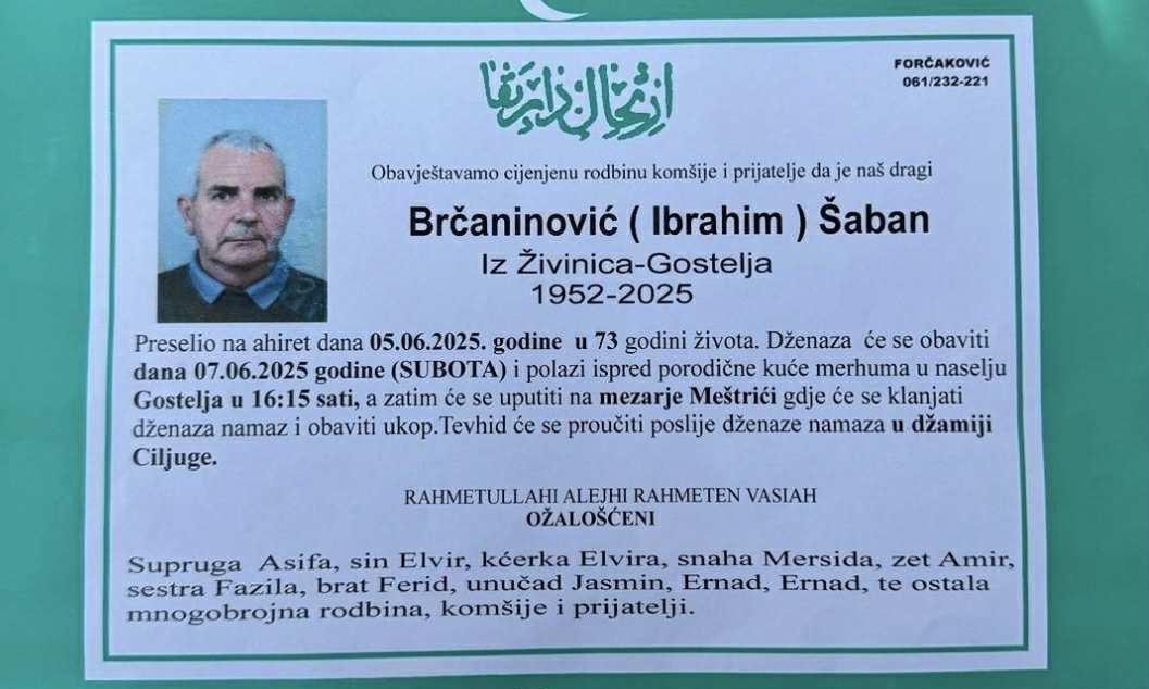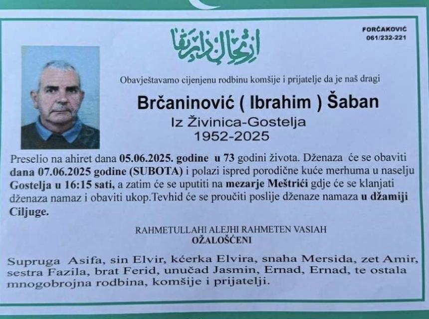Obavještavamo cijenjenu rodbinu komšije i prijatelje da je naš dragi Brčaninović (Ibrahim) Šaban preselio na Ahiret dana 05.06.2025. godine u 73 godini života.