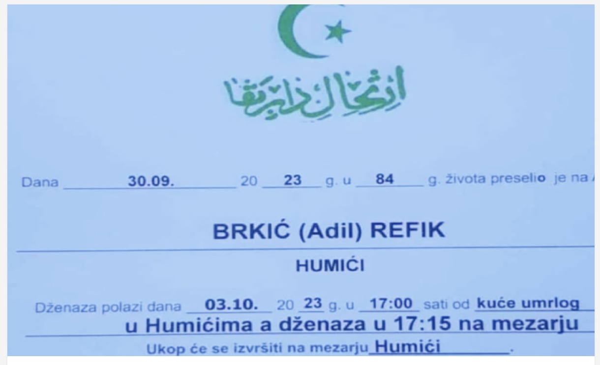 Dzenaza polazi dana 03.10. 20 23 g. u 17:00 sati od kuce umrlog u Humicim, 17:15 na mezarju.